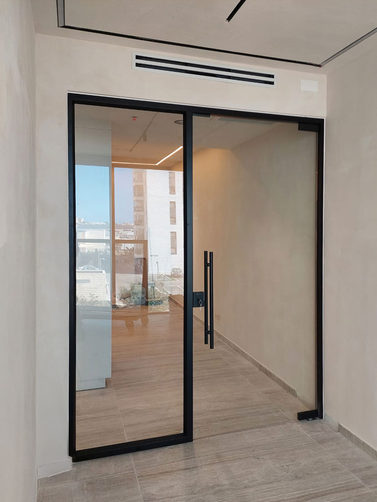 דלתות אוטומטיות/חשמליות אלגנטיות ויוקרתיות להעלאת חווית המבקרים והדיירים, המופעלות על ידי סוגים שונים של גלאים, לחצנים, קוראי כרטיסים ועוד, ובעלות סוללות גיבוי למקרה של הפסקת חשמל.